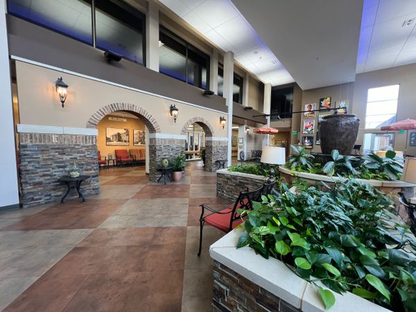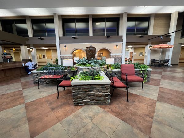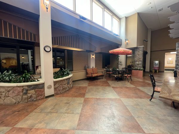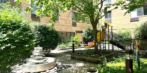 Our beautifully landscaped gardens provide residents, visitors, families, and friends with vibrant experiences featuring colorful foliage, sculptures, and a striking granite fountain. The accessible, year-round courtyard serves as a relaxing outdoor retreat, complete with a dining patio, umbrella tables, and chairs to foster socialization and intergenerational interactions. Children can enjoy the wooden climbing gym and slide while shade trees, paved pathways, lush flower beds, bird baths, and feeders create an inviting atmosphere for gatherings.